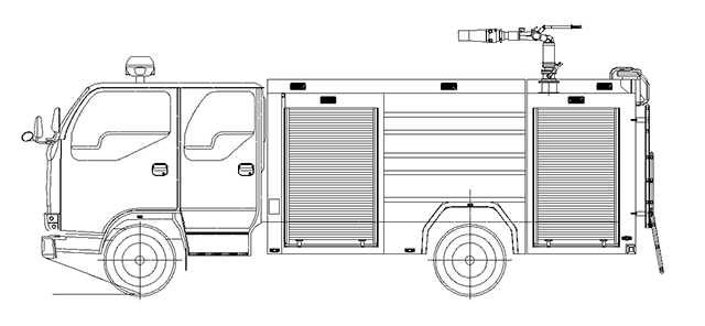 總體布置 | 整車由消防員乘員室和車身兩大部分組成,車身布置采用內(nèi)藏罐式結(jié)構(gòu),左右兩側(cè)為器材箱,中部為水罐,器材箱后部為泵房。 |